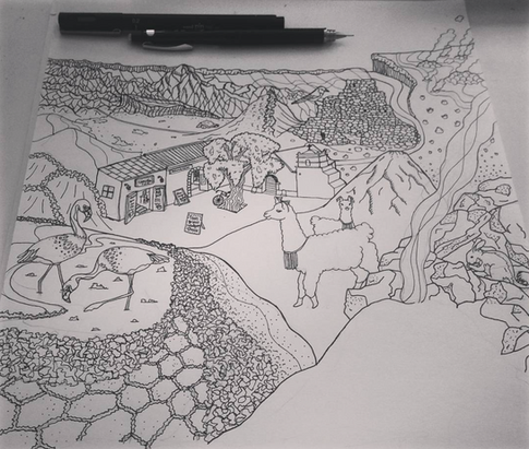 Esta ilustración meticulosamente elaborada de San Pedro de Atacama captura la esencia única de este icónico destino turístico en Chile. Realizada a mano y luego coloreada de forma digital, la obra presenta una fusión de lugares emblemáticos y atracciones de la zona, junto con una variedad de animales que habitan en este entorno desértico.